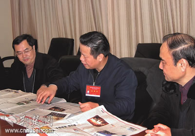 “今年的‘兩會’報道有新意,有創(chuàng)意,圖文并茂,紙網(wǎng)互動,為今年的宣傳工作贏得了‘開門紅’,打響了‘第一炮’!弊蛉障挛,省委常委、宣傳部部長張昌爾到洪山賓館看望了“兩會”宣傳報道人員,對本報的“兩會”報道充分肯定。