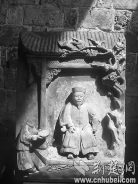 當日,記者在該鎮(zhèn)八角亭村劉貴灣見到了這尊雕像。神龕下面,一村民小心翼翼地抱下一塊40余厘米高,30余厘米寬,10余厘米厚的“石頭”,上面布滿灰塵,一位村民虔誠地為這位“太公”“洗了個澡”,一幅人物情景雕像出現(xiàn)在人們面前(如右圖):一位富態(tài)老年男子端坐太師椅,男子右側前方有一人托盤而立,盤子中間放著茶壺(此人頭部和茶壺都破碎不存),男子左前方則雕有一盆臘梅,直到屋頂,梅花和喜鵲栩栩如生,青磚碧瓦,歷歷在目,而富態(tài)男子就連胡須的“紋路”都雕了出來,雙目傳神。
