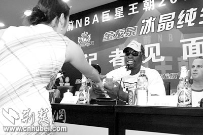 “是張學友來武漢唱狼湖嗎?”“不,是羅德曼,就是那個打籃球的”。在接機的人群里,兩個年輕人議論著。在他們的面前,26個身著緊身運動裝的青春少女手持鮮花,這是組織者安排的“籃球寶貝”;另一邊,攝像機、照相機、采訪話筒一字排開,記者們翹首以待。
