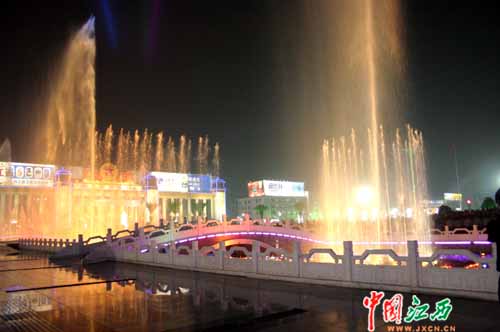 百米長的音樂噴泉伴隨著《中國人民解放軍進行曲》、《走進新時代》等雄壯的樂曲翩翩起舞