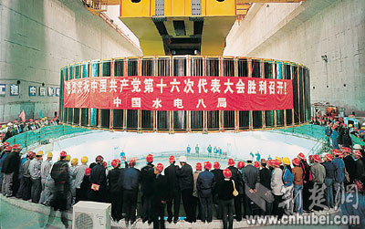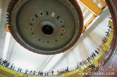 今年8月1日,三峽左岸電廠的最后一臺發(fā)電機組轉(zhuǎn)子吊入機坑(圖二)。令三峽建設(shè)者們感到自豪的是,這同樣是世界上最大的發(fā)電機組,不同的是其零部件國產(chǎn)化程度達(dá)到85%。
