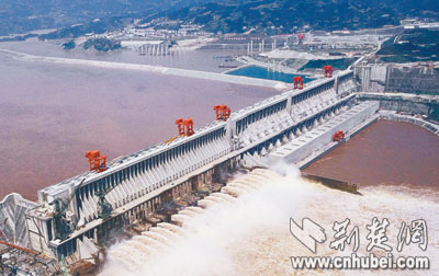三峽工程建筑由大壩、水電站廠房和通航建筑物三大部分組成。大壩為混凝土重力壩,壩軸線全長2309.47米,壩頂高程185米,最大壩高181米。設(shè)有23個泄洪深孔,最大泄洪能力可達(dá)102500立方米/秒。電站壩段位于大壩兩側(cè),共裝機26臺,單機額定容量70萬千瓦的水輪發(fā)電機組,總裝機容量為1820萬千瓦,年發(fā)電量847億千瓦時。通航建筑物包括永久船閘和升船機。永久船閘為雙線五級連續(xù)梯級船閘。單級閘室可通過萬噸級船隊。