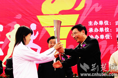 昨日8時(shí)30分許,硚口體育廣場(chǎng)彩旗飄揚(yáng)、鑼鼓喧天。省委常委、武漢市委書記苗圩點(diǎn)燃武漢市第七屆運(yùn)動(dòng)會(huì)火種,交由奧運(yùn)冠軍喬紅引燃各區(qū)火炬,領(lǐng)跑該市近5000人的火炬大傳遞。