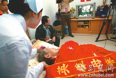英雄母親聶媽媽躺在病床上觀看兒子飛天。本報記者張進攝
