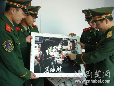 昨日,武警襄樊市支隊(duì)官兵來到航天英雄聶海勝家中,慰問聶媽媽,踏訪英雄的成長(zhǎng)足跡。從墻上取下聶家珍藏的聶海勝的照片,武警官兵無不為這個(gè)戰(zhàn)友自豪。