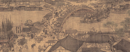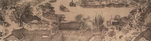 清明上河圖畫長528厘米,高24.8厘米,F(xiàn)藏北京故宮博物院。該圖描繪了清明時節(jié),北宋京城汴梁及汴河兩岸的繁華和熱鬧的景象和優(yōu)美的自然風(fēng)光。作品以長卷形式,采用散點透視的構(gòu)圖法,將繁雜的景物納入統(tǒng)一而富于變化的畫卷中,畫中人物500多人,衣著不同,神情各異,栩栩如生,其間還穿插各種活動,注重情節(jié),構(gòu)圖疏密有致,富有節(jié)奏感和韻律的變化,筆墨章法都很巧妙,頗見功底。