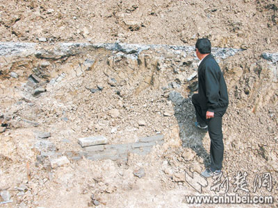 昨日下午,根據(jù)群眾舉報,記者隨襄樊文物局的兩名工作人員趕到現(xiàn)場——宜城市農(nóng)業(yè)局質(zhì)保站基建工地。只見地基挖掘工程并未停下,坑內(nèi)一座古墓局部被破壞,三座古墓完全暴露,到處都是殘磚碎瓦。墓內(nèi)文物隨時有被盜和流失的危險,急待搶救性發(fā)掘保護。但是,現(xiàn)場施工仍在進行。