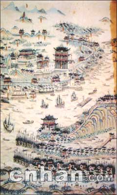 此圖藏于大連市圖書館,手繪彩圖。未標(biāo)明作者姓名和成圖時(shí)間,圖中標(biāo)注了武昌、漢口“龍王廟”等。筆者鑒定此圖為清代中期作品,根據(jù)是圖中有“龍王廟”,而龍王齋建于乾隆四年(1739年),故此圖當(dāng)于1739年以后所繪。但圖中沒有出現(xiàn)漢口城堡,而漢口城堡建于1864年,同時(shí)圖中只繪有木帆船,而未出現(xiàn)現(xiàn)近代輪船。武漢江面出現(xiàn)航運(yùn)和輪船是1862年以后。可知,此圖當(dāng)成于1862年前。可大體界定此圖繪于1739年至1862年之間。