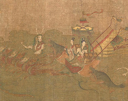 此圖是根據(jù)三國(guó)(220--265年)魏人曹植所寫《洛神賦》而創(chuàng)作的故事畫。畫面開首描繪曹植在洛水河邊與洛水女神瞬間相逢的情景,曹植步履趨前,遠(yuǎn)望龍鴻飛舞,一位“肩若削成,腰如約素”、“云髻峨峨,修眉聯(lián)娟”的洛水女神飄飄而來(lái),而又時(shí)隱時(shí)現(xiàn),忽往忽來(lái)。后段畫洛神駕六龍?jiān)栖囯x去,玉鸞、文魚、鯨鯢等相伴左右,洛神回首張望,依依不舍,一種無(wú)奈離析之情顯現(xiàn)畫面。
