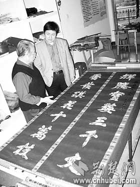 荊楚網(wǎng)消息(楚天都市報)(記者何君輝)昨日,收藏者王先生在漢繡傳人任本榮家中,展示了自己珍藏的一幅刺繡對聯(lián)。對聯(lián)長2.4米,以花朵圖案拼接出“輝騰寶婺三千丈香發(fā)琪花十萬枝”字樣。王先生說,自己十多年前在地攤上花400元購得這件繡品,一直沒有機(jī)會為它“驗明正身”