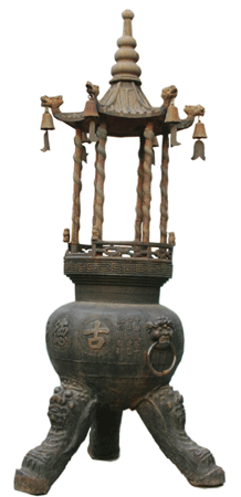 王殿和圓通寶殿之間,安放著一個(gè)鑄造于民國(guó)初年的寶鼎,這是1997年時(shí),寺內(nèi)的師傅們從寺院的地下挖出來(lái)的。時(shí)光磨洗,老香爐和圓通寶殿的墻壁一樣斑駁,不過(guò)“古德寺”以及“中華民國(guó)十四年歲”等字樣依然清晰。