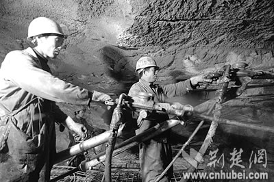 穿著雨衣的工人們手持風(fēng)槍,正在腳手架上下打爆破眼,山體里的水嘩啦啦直往下噴,然后順著挖好的水槽排向洞外,最多時一天要排3000立方米!斑@水算小的!”也許是察覺出我們眼神里的擔(dān)心,包秀峰輕松笑笑,仿佛一切都在他們掌控中。他甚至調(diào)侃說,“瞧,我們都穿皮鞋上班,施工環(huán)境沒你們想象中那么艱難!