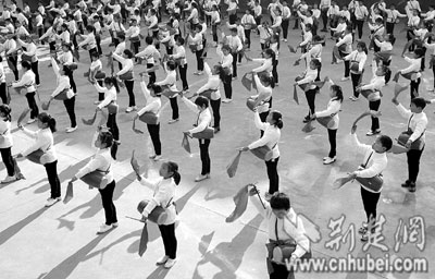 昨日,武漢市石喬口區(qū)輕汽小學學生在大課間進行腰鼓訓練(下圖)。為保障農民工子女順利入學就讀,該區(qū)投資1000多萬元改善全區(qū)農民工子女學校的辦學條件,通過設立助學金、減免學雜費等形式,幫助20078名農民工子女順利入學就讀(右圖)。(記者張鴻 通訊員楊斌 周浩攝)