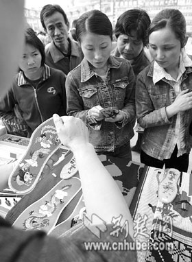 荊楚網(wǎng)(湖北日報)(記者 王威 通訊員 王奇 攝)20日,參加全省農(nóng)民工職業(yè)技能鑒定工作會議的各地代表,在孝感市人民廣場擺開擂臺,展示他們選送的出自于農(nóng)民工之手的各種絕技絕活,并向農(nóng)民工贈送價值百萬元的技能鑒定圖書。這是我省首次舉辦農(nóng)民工技能鑒定成果展,從精美的竹器到精致的鋼模具,從精細(xì)電子產(chǎn)品到鄉(xiāng)土氣息濃郁的刺繡鞋墊,上百種展品不僅引起了市民的濃厚興趣,也反映出農(nóng)民正由靠勤勞致富向靠知識技能致富轉(zhuǎn)變。記者從會上獲悉,截至8月底,我省已組織農(nóng)民工職業(yè)技能鑒定26.8萬人次,預(yù)計全年可實現(xiàn)40萬人次,到“十一五”期末,全省技能勞動者占社會從業(yè)人員的比重將達(dá)到50%。