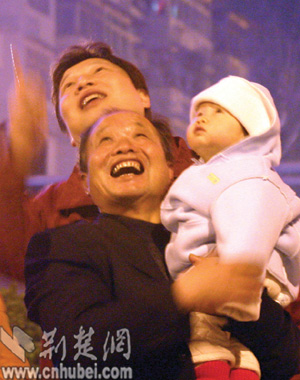 漢陽的劉春華一大家子人特別引人注目,因?yàn)樗麄優(yōu)榇蠡镎故玖艘粓鲂⌒偷乃饺搜婊鹜頃?huì)。她的四兄弟姊妹,從面包車上扛下大包大包箱子般大小的焰火,依次在江邊擺開。不一會(huì),幾道彩色的光柱就在天空閃耀,彩色幕布被拉開。震耳的轟響,讓孩子們又愛又怕,躲在父母的身后偷偷地捂著耳朵跳鬧。70多歲的爺爺奶奶微笑著,安靜地看著自己十多個(gè)子子孫孫們歡暢的一幕。