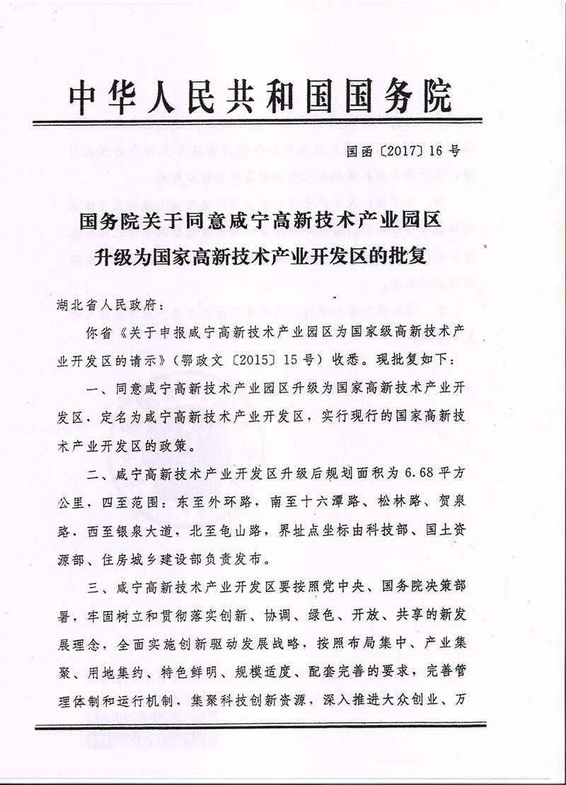 你省《關(guān)于申報咸寧高新技術(shù)產(chǎn)業(yè)園區(qū)為國家級高新技術(shù)產(chǎn)業(yè)開發(fā)區(qū)的請示》(鄂政文〔2015〕15號) 收悉?,F(xiàn)批復(fù)如下: