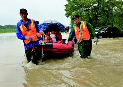 圖為:通城四莊鄉(xiāng)小井村道路被洪水阻斷,消防劃艇轉移村民