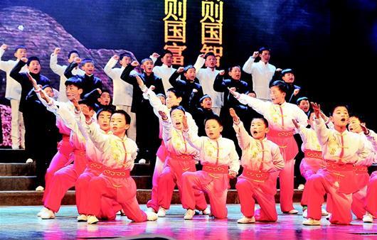 “野無遺賢,萬邦咸寧;首出庶物,萬國咸寧……”12月19日,由省委宣傳部、省教育廳、省廣播電視臺聯(lián)合主辦的“同聲誦經典——2017湖北省‘起點閱讀·朝讀經典’校園巡回展演活動”走進咸寧。當天下午,在咸寧市會議中心,稚嫩的童聲、整齊的朗誦,配舞臺水墨畫的背景,讓在場的近千名中小學生如入詩畫之境。“唧唧復唧唧,木蘭當戶織。不聞機杼聲,唯聞女嘆息……”一首《木蘭詩》讓觀眾們猶如置身于北朝的烽煙中,青年花木蘭敢于擔當?shù)木褡屓司磁澹档卯敶嗌倌陮W習借鑒。