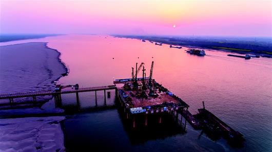 湖北日?qǐng)?bào)訊 圖為:赤壁長(zhǎng)江大橋進(jìn)入全面施工。(湖北日?qǐng)?bào)全媒記者 陳勇 通訊員 馬海斌 攝)