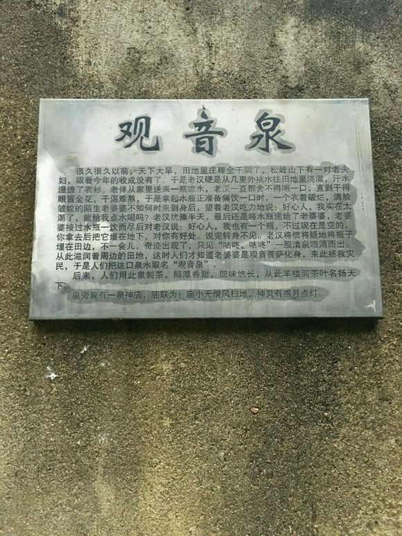 羊樓洞東面松峰山北麓有蒲圻四十八名泉之——觀音泉。觀音泉水穿街而過,泉水之名取自古鎮(zhèn)之南的一口古井,泉水清冽甘甜,永不干涸。傳說是大慈大悲的觀世音菩薩,為保這里的山民與茶樹不受干旱之苦,埋下寶瓶,化為泉井。
