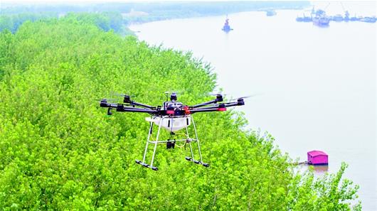湖北日?qǐng)?bào)訊 6月12日,在嘉魚縣長(zhǎng)江干堤陸溪段,無(wú)人機(jī)在防浪林上空噴灑低毒無(wú)殘留農(nóng)藥,防治病蟲害。近期,嘉魚段長(zhǎng)江防浪林出現(xiàn)了蟲卵和幼蟲,嘉魚縣林業(yè)局迅速進(jìn)行綜合防治,全面維護(hù)從陸溪至簰洲灣109公里長(zhǎng)江沿線及洲灘6萬(wàn)余畝楊樹林。