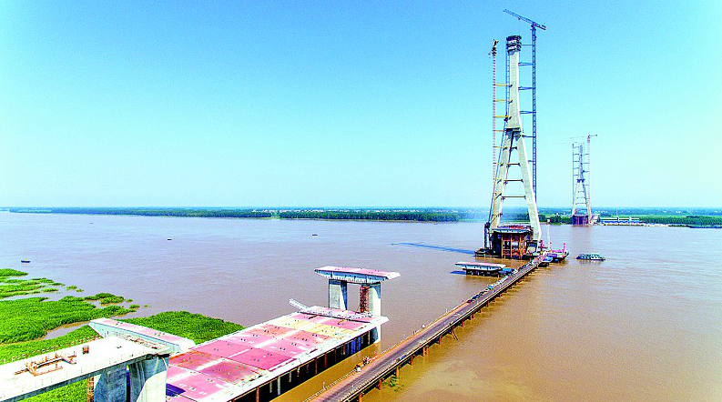 湖北日?qǐng)?bào)訊 (記者江萌、通訊員周漓)7月16日,嘉魚(yú)長(zhǎng)江公路大橋主塔成功封頂(如圖),即將進(jìn)入主橋鋼箱梁安裝、橋面施工等上部構(gòu)造施工。嘉魚(yú)長(zhǎng)江公路大橋連接洪湖與嘉魚(yú),是武漢城市圈外環(huán)高速的重要控制性工程,大橋主塔封頂將加快外環(huán)高速全面合龍畫(huà)圓。