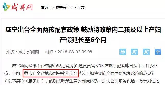 報道顯示,咸寧是湖北省率先出臺“全面兩孩配套政策”的地級市 。