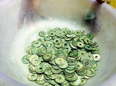 村民丁師傅挖到了數(shù)百枚古幣,他用臉盆裝著向記者展示。記者看到,這些古幣型制不一,有的直徑約3厘米,上面刻著瘦金體的“崇寧通寶”;有的直徑約2厘米或1.5厘米,刻著“紹圣元寶”“天圣元寶”等字樣。