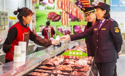 12月27日,武邑縣食品和市場(chǎng)監(jiān)督管理局執(zhí)法人員在一家超市檢查肉類銷售人員的健康證。