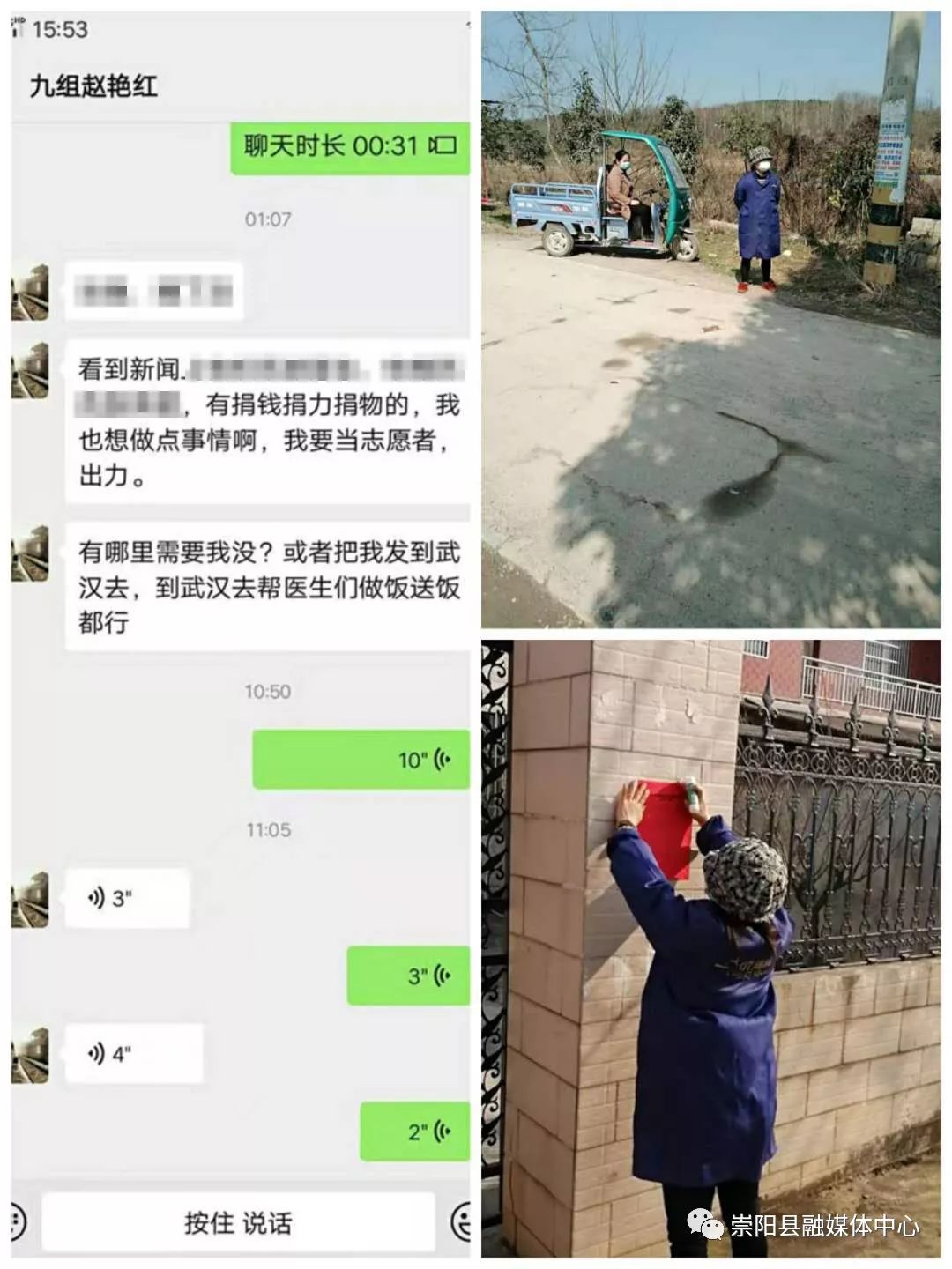 “有哪里需要我嗎?我要當(dāng)志愿者,哪怕是到武漢去為醫(yī)生做飯送飯都行?!边@是青山鎮(zhèn)城萬村九組村民趙艷紅2月2日凌晨1點,向村婦聯(lián)主席發(fā)出的“請戰(zhàn)”信息。