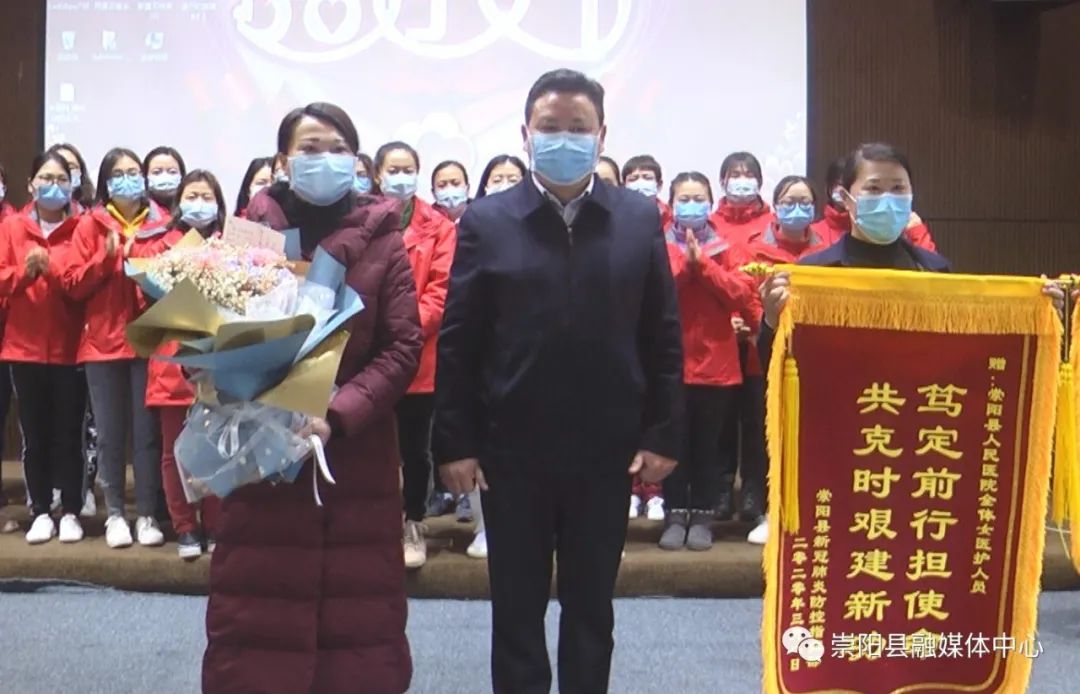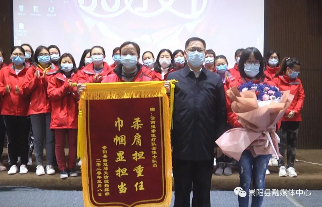 活動中,縣委副書記、縣長鄭俊華向云南援崇醫(yī)療隊贈授“柔肩擔(dān)重任·巾幗顯擔(dān)當(dāng)”感謝錦旗,縣委副書記、縣委政法委書記程冰野為崇陽縣人民醫(yī)院授予“巾幗建功集體”榮譽錦旗,同時,向每一位云南援崇醫(yī)療隊女醫(yī)護(hù)人員和奮戰(zhàn)在戰(zhàn)“疫”最前線的女醫(yī)生、女護(hù)士代表送上了鮮花和節(jié)日禮物。