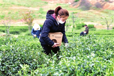 據(jù)了解,該基地由在外創(chuàng)業(yè)回鄉(xiāng)人員于2015年興建,占地500余畝,目前已逐步成園?;刈?月6日復(fù)工以來(lái),日平吸納當(dāng)?shù)貏趧?dòng)力50余人次采茶。
