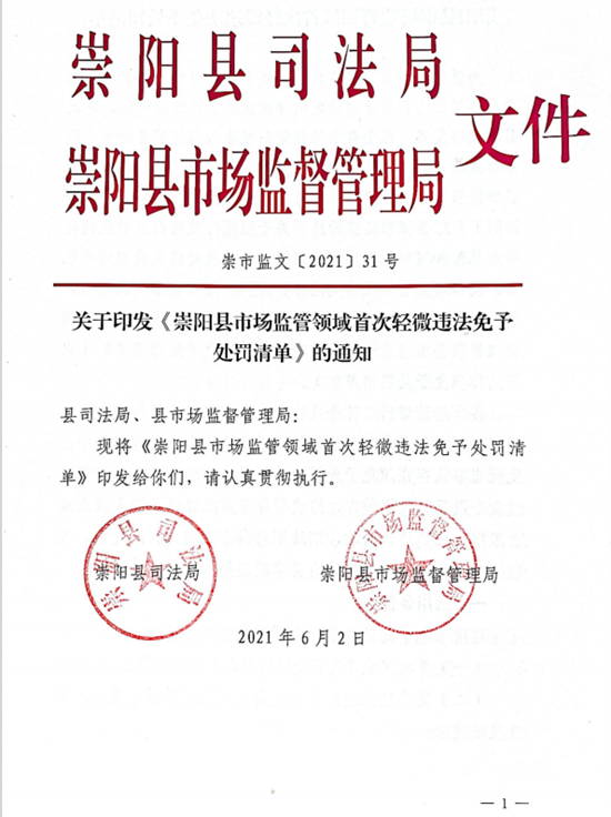 6月2日,崇陽縣司法局、縣市場監(jiān)管局在廣泛征求意見的基礎上,印發(fā)了《崇陽縣市場監(jiān)管領域首次輕微違法免予處罰清單》(2021年版)。