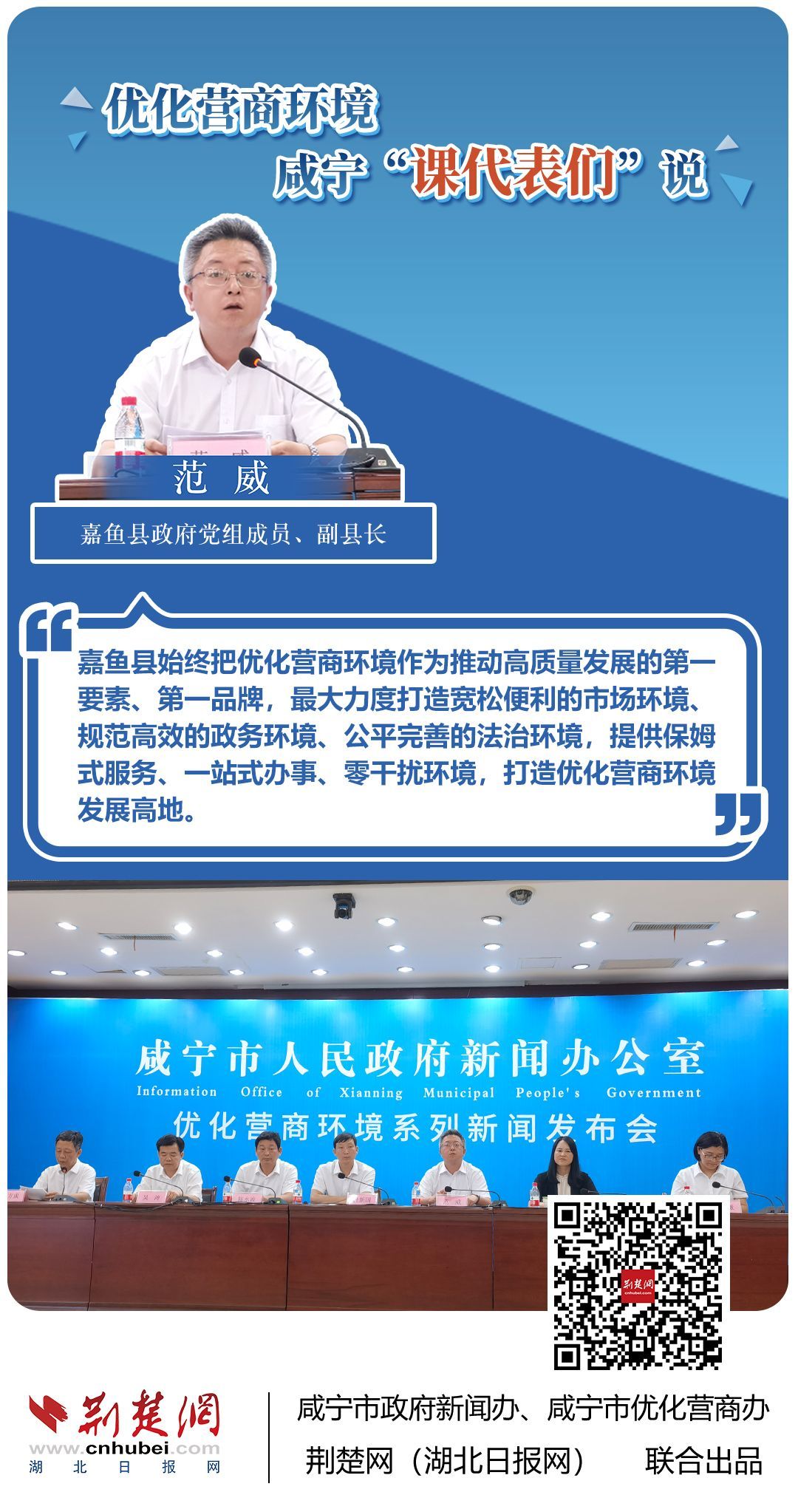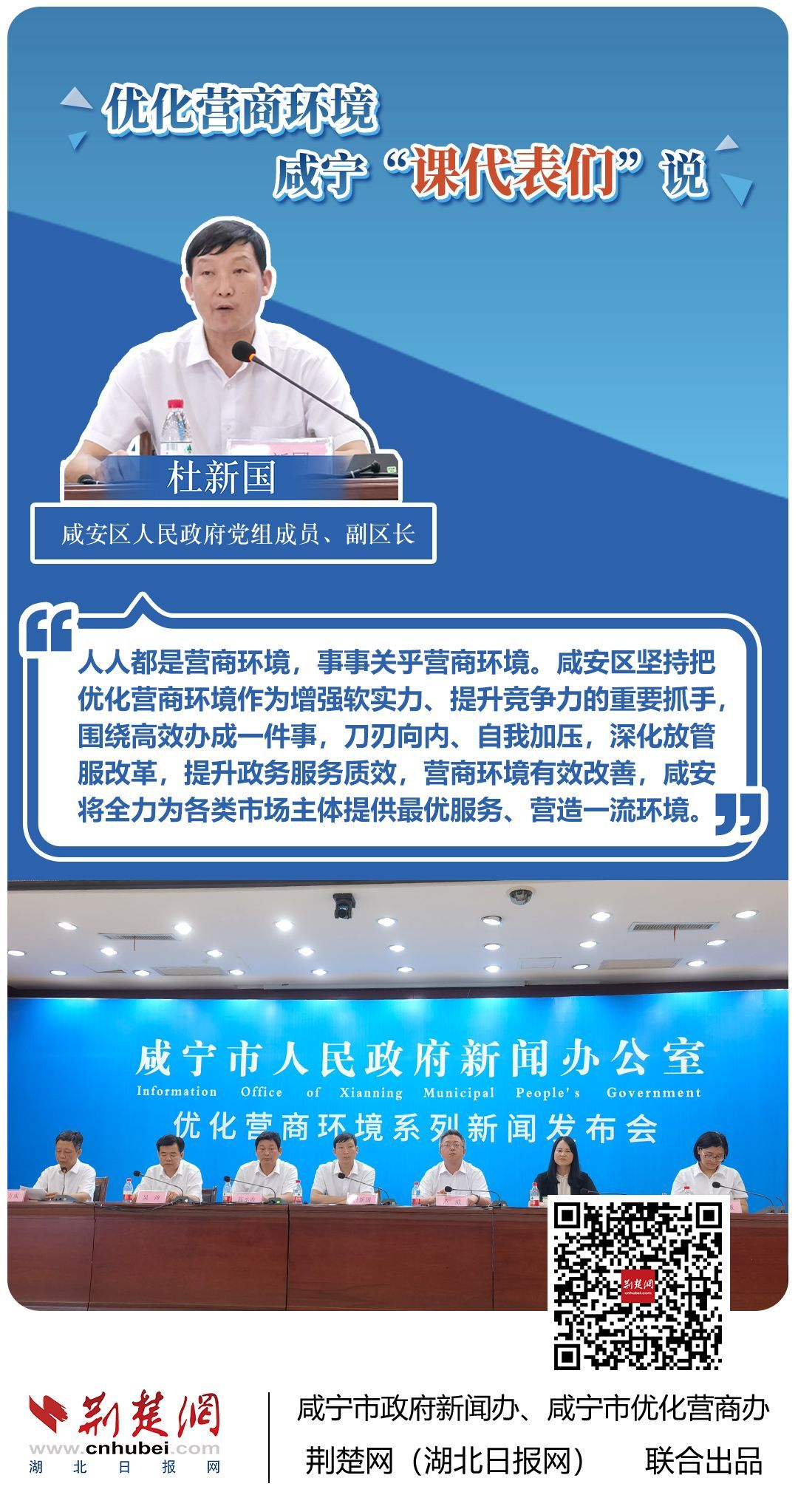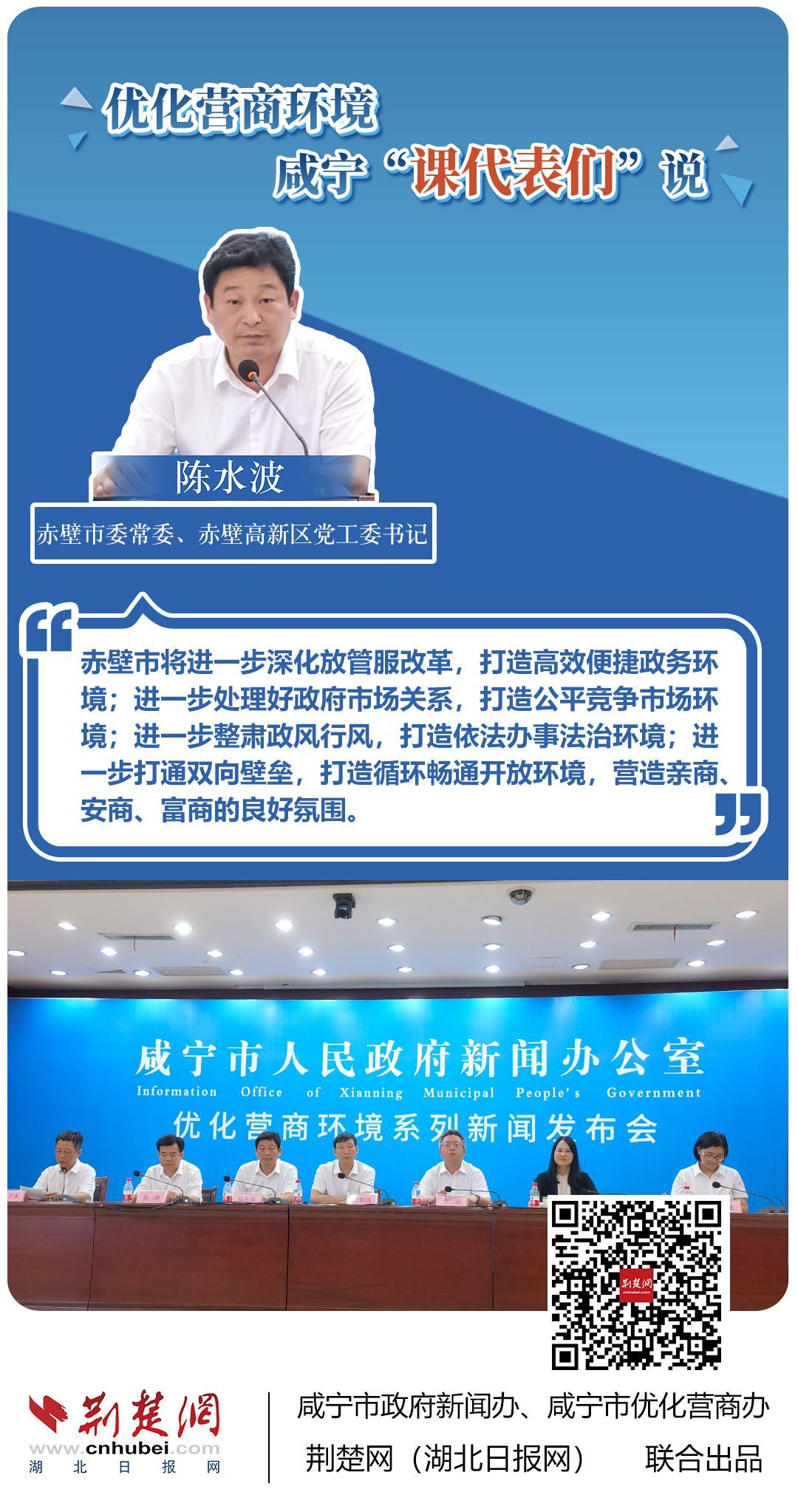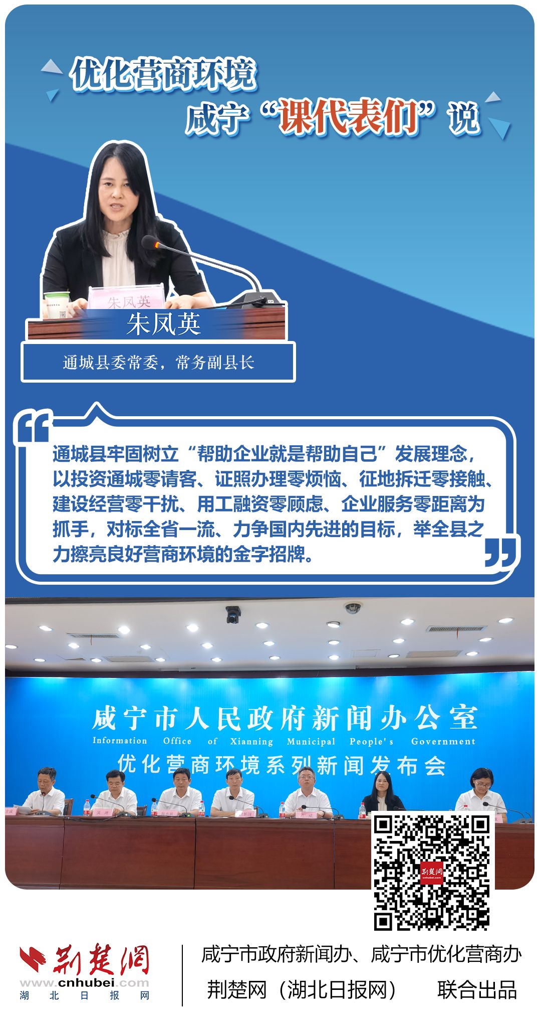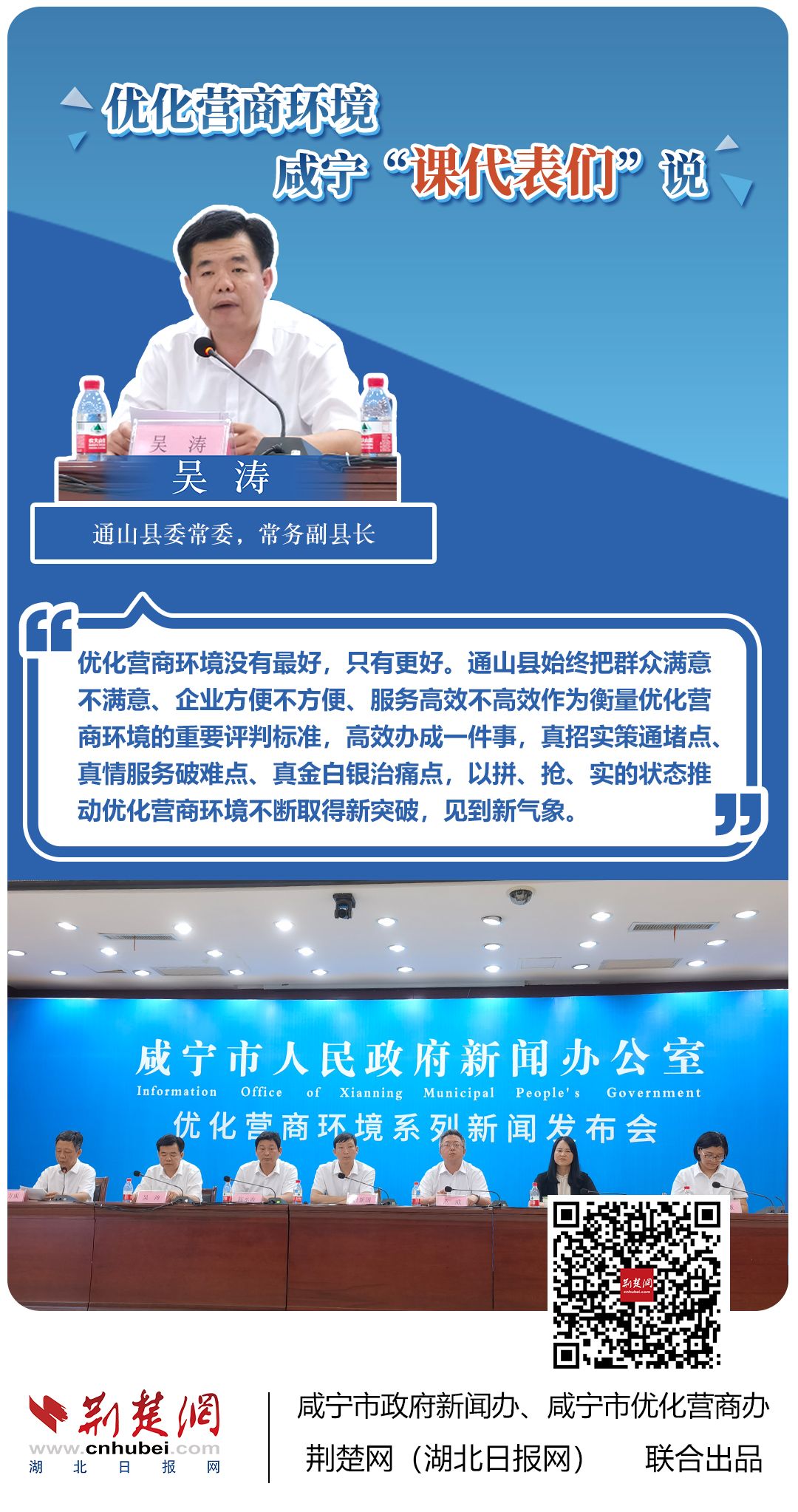 荊楚網(湖北日報網)訊(記者 田城 通訊員 孫方成 張永紅)跨省通辦、“零干擾環(huán)境”、最簡流程優(yōu)服務、深化“放管服”改革、整肅行風政風……7月20日下午,咸寧市召開優(yōu)化營商環(huán)境新聞發(fā)布會。會上,咸安區(qū)、嘉魚縣、赤壁市、通城縣、崇陽縣、通山縣6個縣市區(qū)優(yōu)化營商環(huán)境發(fā)言人亮相,全面介紹當地優(yōu)化營商環(huán)境有關情況,持續(xù)推進咸寧市營商環(huán)境朝著更優(yōu)、更好方向前進。
