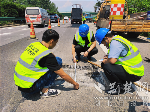養(yǎng)護(hù)人在驕陽(yáng)下測(cè)量路面坑槽。 通訊員 供圖