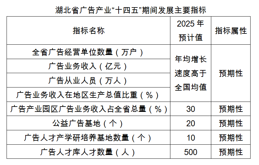 到2025年,預(yù)期全省廣告經(jīng)營單位、業(yè)務(wù)收入、從業(yè)人員數(shù)量等關(guān)鍵性指標(biāo)年均增長速度高于全國,廣告業(yè)務(wù)收入在地區(qū)生產(chǎn)總值中的比重超過全國均值,廣告產(chǎn)業(yè)園區(qū)廣告業(yè)務(wù)收入等關(guān)鍵性指標(biāo)達(dá)到全省總量30%以上,建設(shè)公益廣告基地20個(gè),廣告人才產(chǎn)學(xué)研培養(yǎng)基地 10個(gè),全省廣告人才庫人才達(dá)到500人。