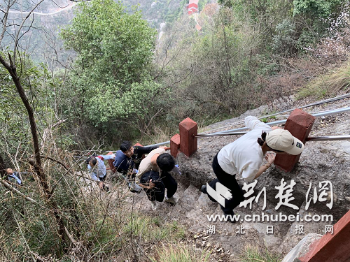 徒步攀登陡峭的石階到山頂核查數據。通訊員供圖