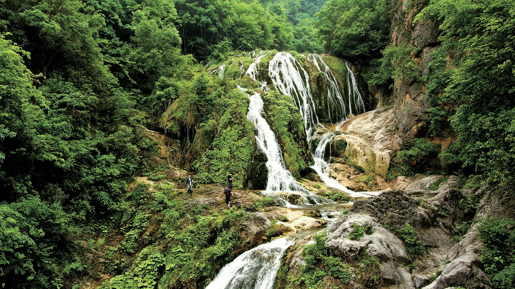 落差二十米的大瀑布如白練懸空,水聲震耳欲聾,人站在瀑布中段,頓顯渺小。