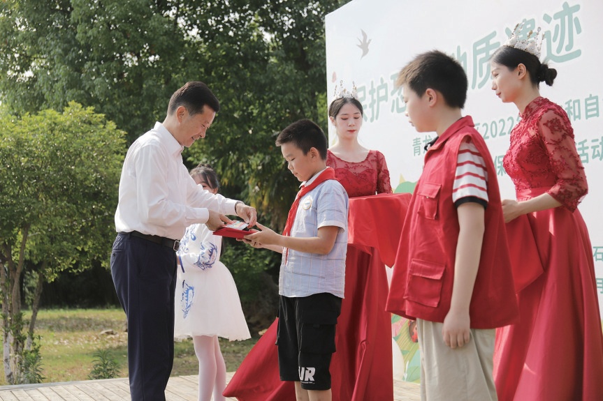 湖北青龍山恐龍蛋化石群國家級自然保護(hù)區(qū)管理局局長、黨組書記姚天國為獲獎學(xué)生頒獎。