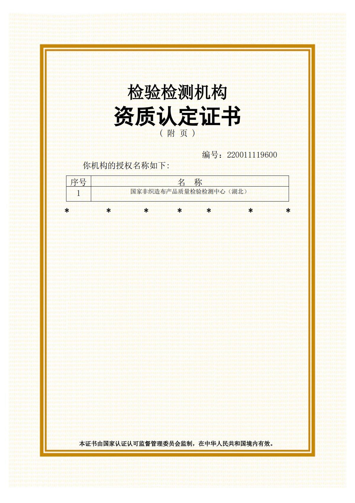 國家非織造布產(chǎn)品質量檢驗檢測中心(湖北)(籌)獲得國家級資質認定證書