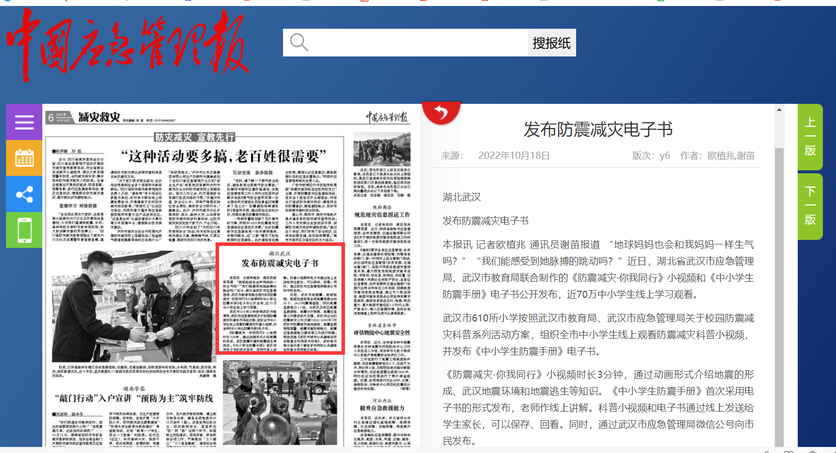 《防震減災·你我同行》小視頻時長3分鐘,通過動畫形式介紹地震的形成、武漢地震環(huán)境和地震逃生等知識。《中小學生防震手冊》首次采用電子書的形式發(fā)布,老師作線上講解??破招∫曨l和電子書通過線上發(fā)送給學生家長,可以保存、回看。同時,通過武漢市應急管理局微信公號向市民發(fā)布。