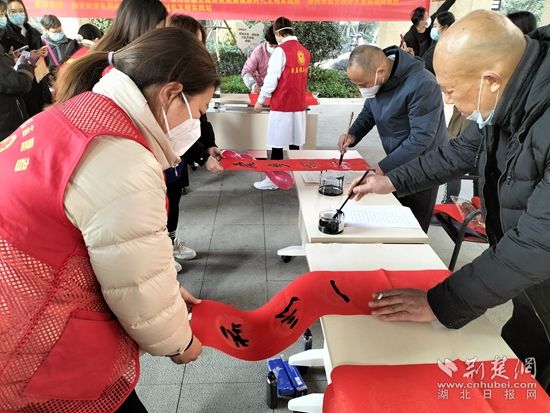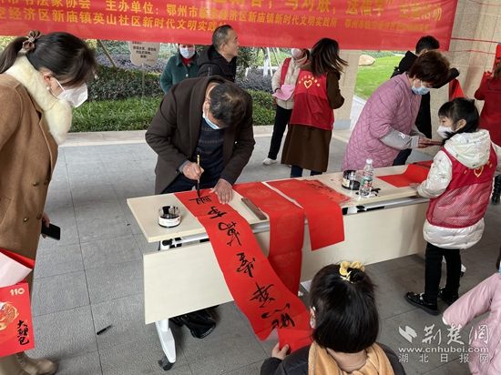 在銀海龍辰小區(qū),來自鄂州市書法協(xié)會的各位書法家現(xiàn)場“揮毫潑墨”,應(yīng)小區(qū)居民的要求,現(xiàn)場書寫春聯(lián)和“福”字。此次活動,共計為居民書寫贈送160副春聯(lián)、100幅“?!弊?。