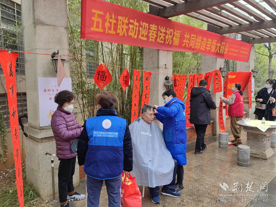 除了喜慶的春聯(lián),便民服務(wù)攤位也格外熱鬧。在現(xiàn)場(chǎng)志愿者及社工的引導(dǎo)下,社區(qū)老年協(xié)會(huì)志愿者現(xiàn)場(chǎng)為長(zhǎng)者免費(fèi)理發(fā),為轄區(qū)老年居民感受到了社區(qū)的關(guān)心和愛(ài)護(hù)。