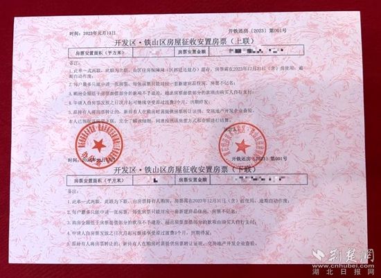 “這是我區(qū)年初推出試行房票安置制度后發(fā)放的首張房票,也是全市首張房票。”開發(fā)區(qū)·鐵山區(qū)住房保障局開發(fā)科科員王哲介紹,通過房票安置方式,一方面縮短了拆遷群眾安置時(shí)間,另一方面拓寬了安置房源,打通住房轉(zhuǎn)換通道后,拆遷群眾可以根據(jù)個(gè)人需求購(gòu)買心儀的商品房用來安置,選擇范圍更大了、居住環(huán)境更好了、生活品質(zhì)更高了。