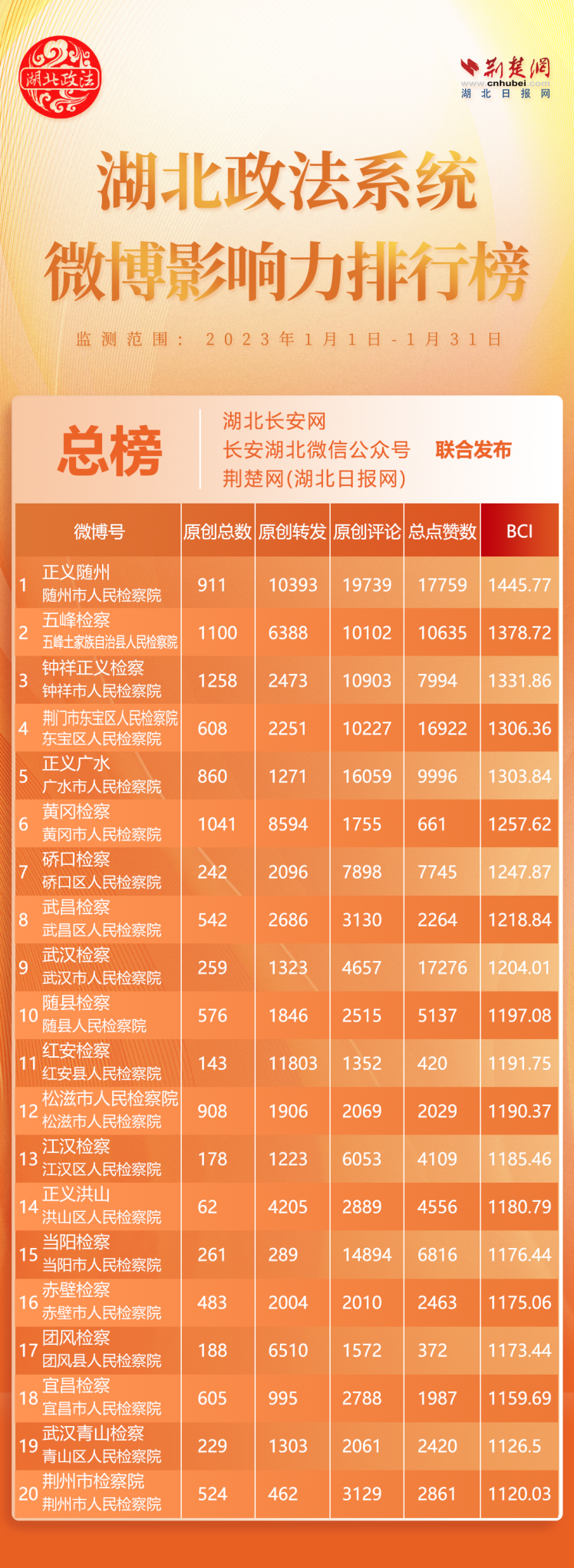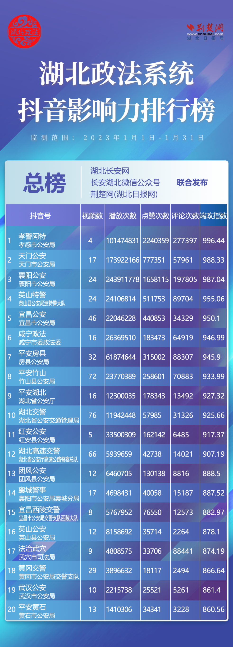 荊楚網(wǎng)(湖北日?qǐng)?bào)網(wǎng))訊(記者胡小軍)2月13日,湖北省委政法委官網(wǎng)湖北長(zhǎng)安網(wǎng)、官微長(zhǎng)安湖北聯(lián)合荊楚網(wǎng)(湖北日?qǐng)?bào)網(wǎng))、楚天輿情數(shù)據(jù)研究院發(fā)布湖北政法系統(tǒng)新媒體影響力排行1月榜單,黃岡政法系統(tǒng)多家單位入圍。