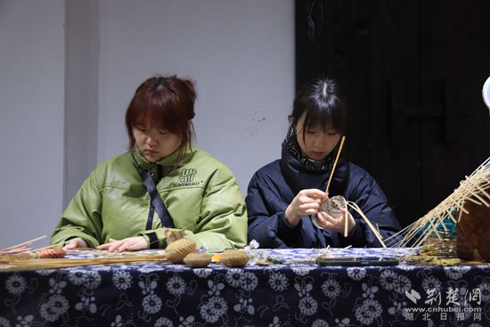 在演出現(xiàn)場旁的鄉(xiāng)村記憶館內(nèi),馬橋油畫風(fēng)景寫生展、鄂南雕花剪紙作品展同時吸引著游人的目光。來自湖北科技學(xué)院的學(xué)生正在展廳中編織特色竹制品,繪制富有當(dāng)?shù)孛袼滋攸c的文創(chuàng)作品。