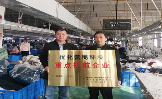 此前,英山縣紀委監(jiān)委“護航”行動專班在對全縣重點企業(yè)進行走訪時,湖北如普帽業(yè)有限公司反映該公司門口的“優(yōu)化營商環(huán)境重點護航企業(yè)”牌匾是2020年5月懸掛的,因常年風吹日曬,導致字跡斑駁不清。隨后,該縣紀委監(jiān)委將這一問題納入工作臺賬,立即協(xié)調重新制作牌匾,于是便有了開頭“換牌”的一幕,這也是該委深化“護航行動”的一個生動體現。