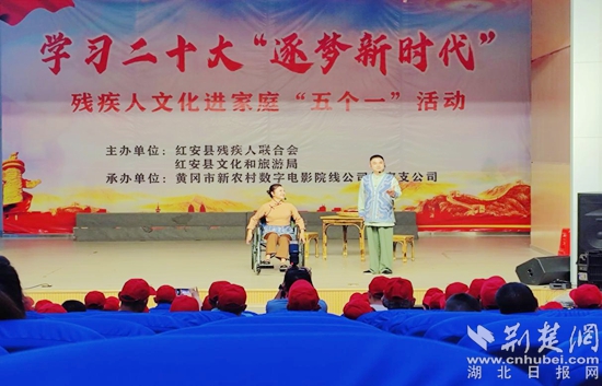 在文化館演出廳,楚劇團(tuán)為殘疾人帶來了文化盛宴。大型舞蹈《花開盛世》、女聲獨唱《好人就在身邊》、楚劇小品《鹽紅》、舞蹈《床前明月光》、男聲獨唱《這一拜》、方言小品《薯你有味》、女聲獨唱《天耀中華》、大型舞蹈《請到紅安來游玩》等節(jié)目。