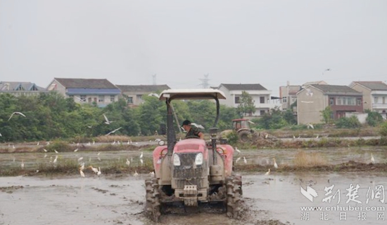 水田中,打田機(jī)來(lái)回穿梭,工人們?cè)诿χ嗨?、播種,到處都是一片生機(jī)勃勃的繁忙景象。一群群白鷺鳥(niǎo)在人與機(jī)器之間飛來(lái)飛去嬉耍,織就出一幅喜樂(lè)祥和的圖畫(huà)。