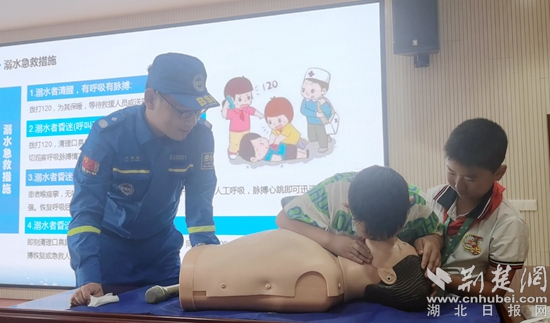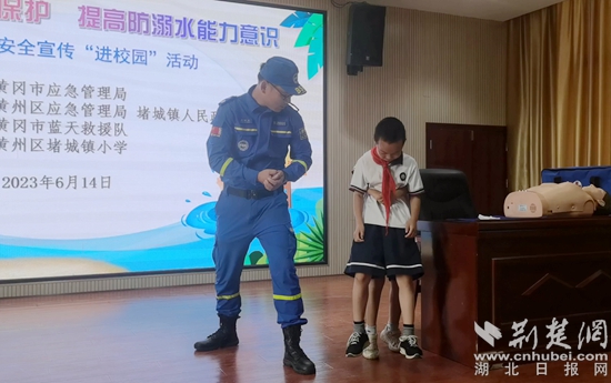 走進(jìn)堵城小學(xué),來(lái)自黃岡市藍(lán)天救援隊(duì)的專(zhuān)業(yè)講師正向同學(xué)們宣傳防溺水安全知識(shí),對(duì)突發(fā)溺水應(yīng)急處置、心肺復(fù)蘇術(shù)等自救互救技能進(jìn)行了演示。